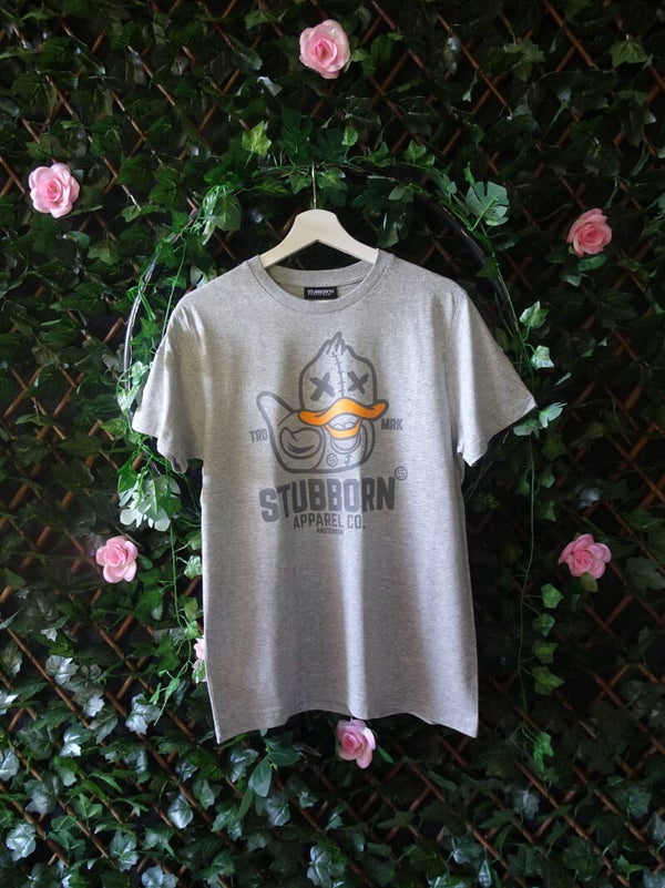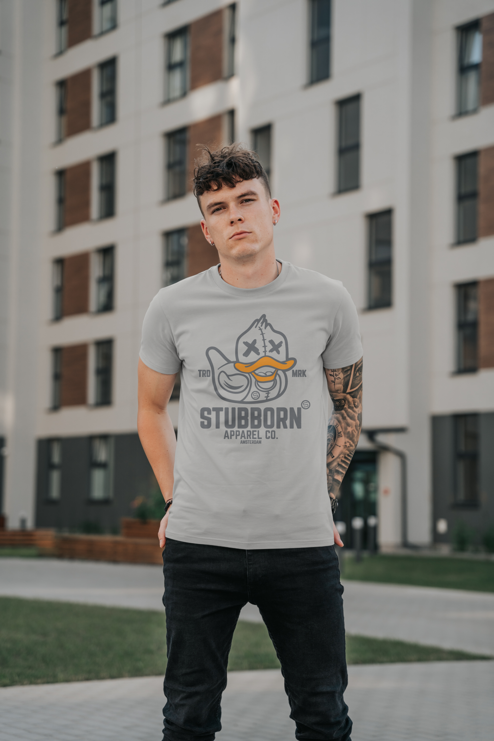 This design is screenprinted on a regular fit Unisex t-shirt with the "STUBBORN DUCK" printed on the front.