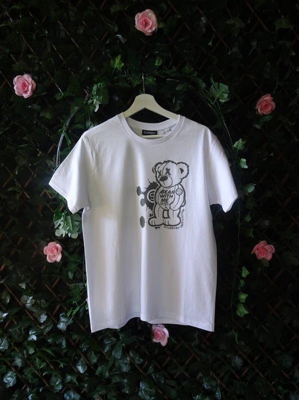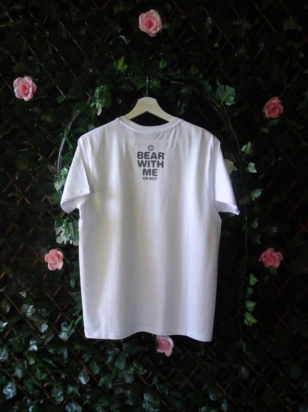 This design is screenprinted on a regular fit Unisex t-shirt with "THE BEAR" printed on the front, and "BEAR WITH ME OR NOT" text on the back.