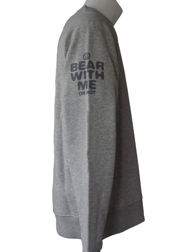 This design is screenprinted on a regular fit Unisex sweater with the "BEAR" printed on the front, and "BEAR WITH ME OR NOT" text on the sleeve.